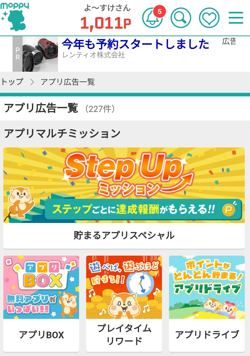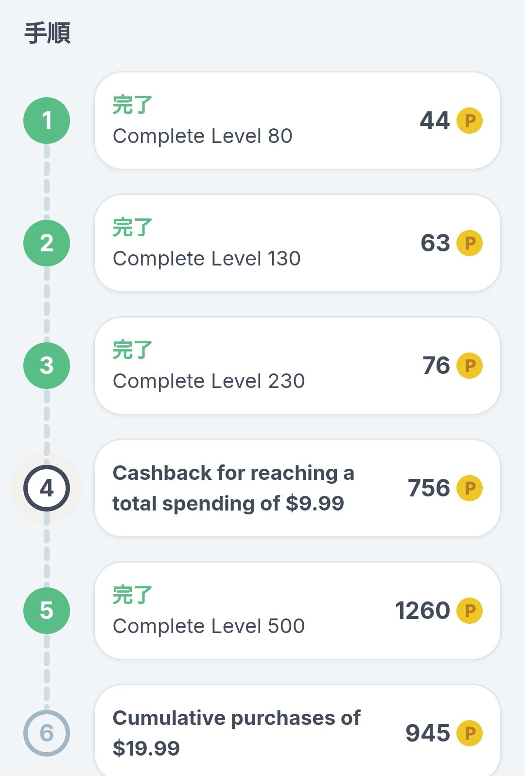 完了となっている①②③⑤は私が条件をクリアしたものです。合計で1443円分のポイントを稼ぎました。