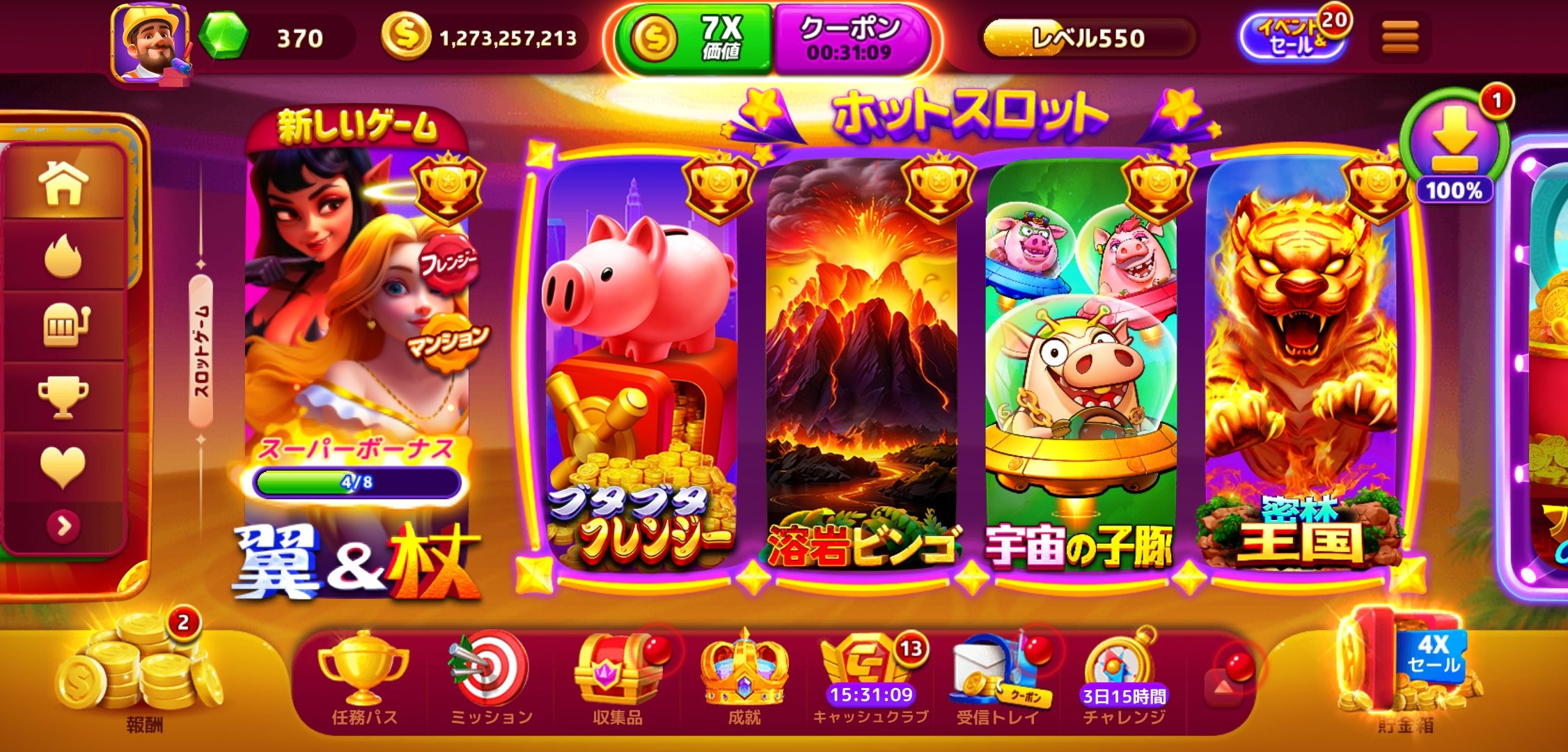 ベットするコインは最初はずっとマックスベットでいいんですが、レベル100手前あたりから、手持ちコインに応じたプレイをして、たくさんのミッションをクリアできるようにしましょう。